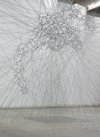 作品由一个复杂的丝制表面的弹力绳网组成,中心部位勾勒出由封闭的多面体矩阵组成的一个整体区域,如同几何学中的泡影矩阵。